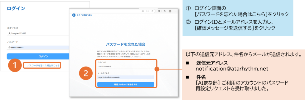 ログイン画面の[パスワードを忘れた場合はこちら]をクリックし、パスワード再設定用のメールより、パスワードを再設定してください。