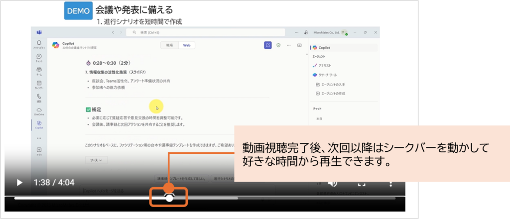 視聴が完了すると、次回以降はシークバーを自由に動かして、好きな時間から再生できるようになります。