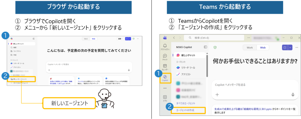 エージェントビルダーの起動には、ブラウザのCopilot画面から起動する方法とTeamsからCopilotを開いて起動する方法があります。