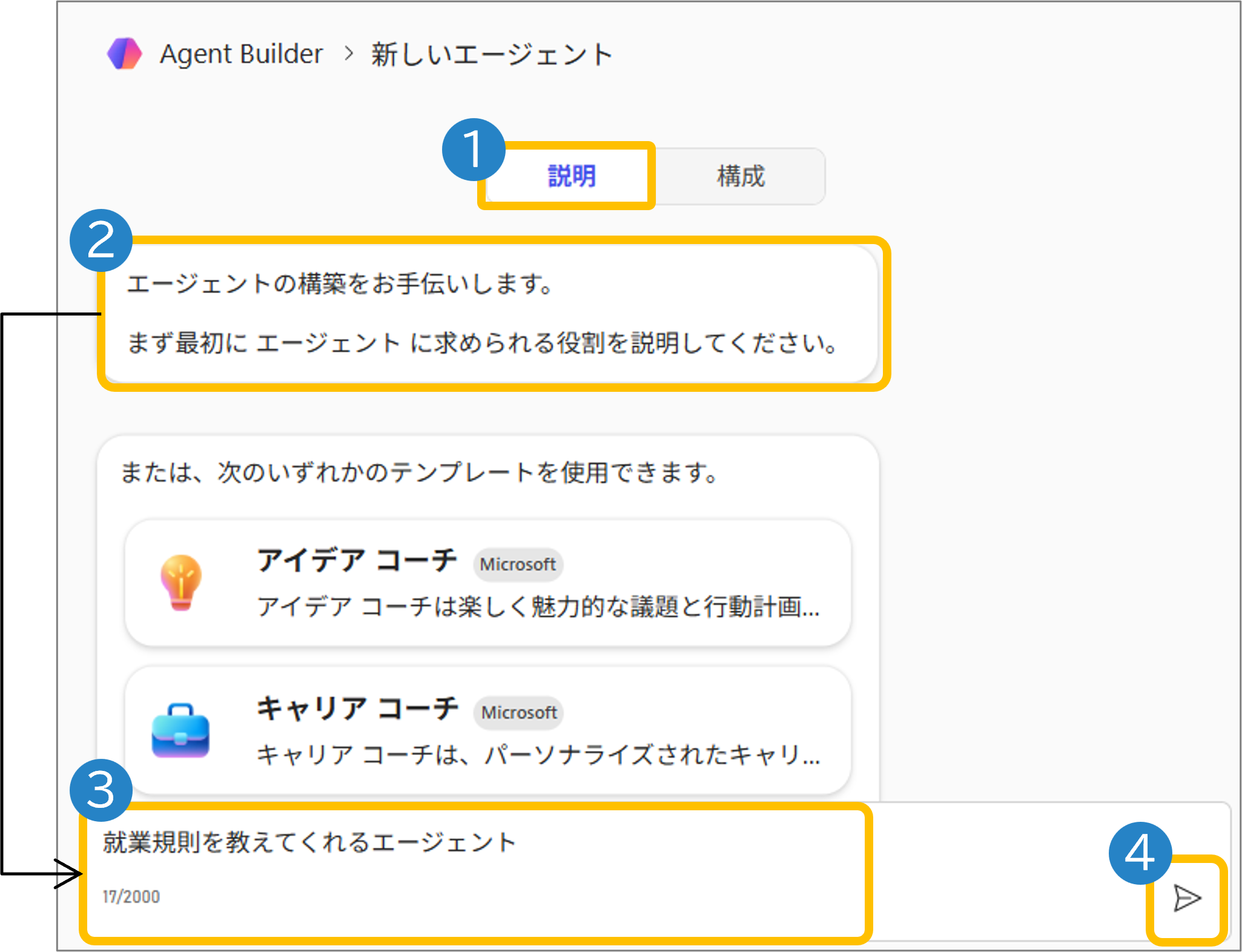 エージェントビルダーを起動すると、「説明」「構成」を設定する画面が表示されます。