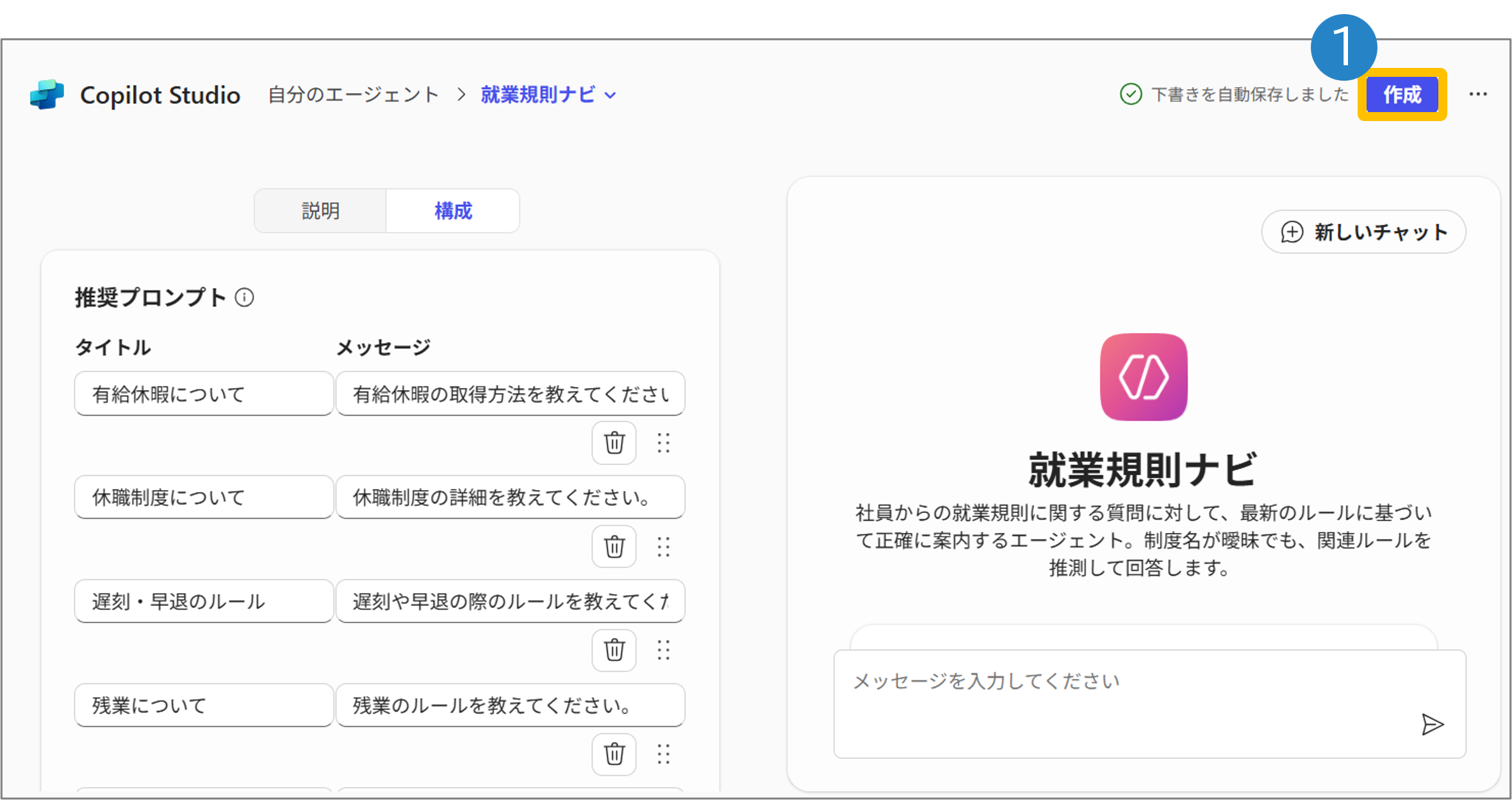 今回は就業規則ナビエージェントの作成を通して、エージェントビルダーでエージェントを作成する手順についてお伝えいたしました。