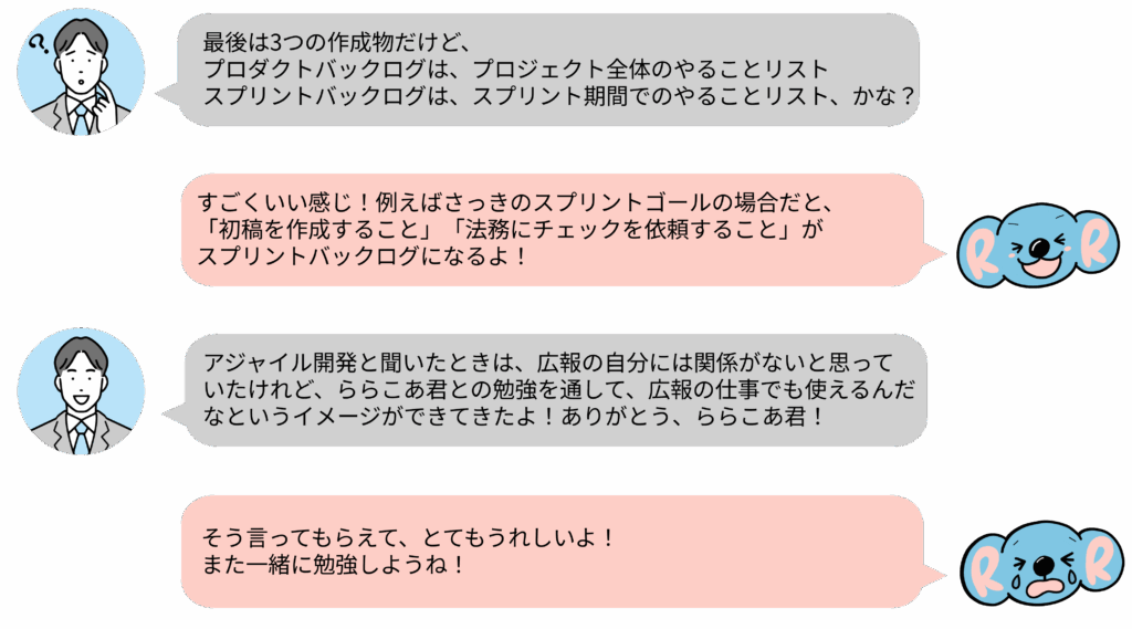 全4回のららこあ君達との勉強はいかがだったでしょうか?開発部門以外でアジャイルがどう使えるのか、少しでもイメージをお持ちいただけましたら幸いです。