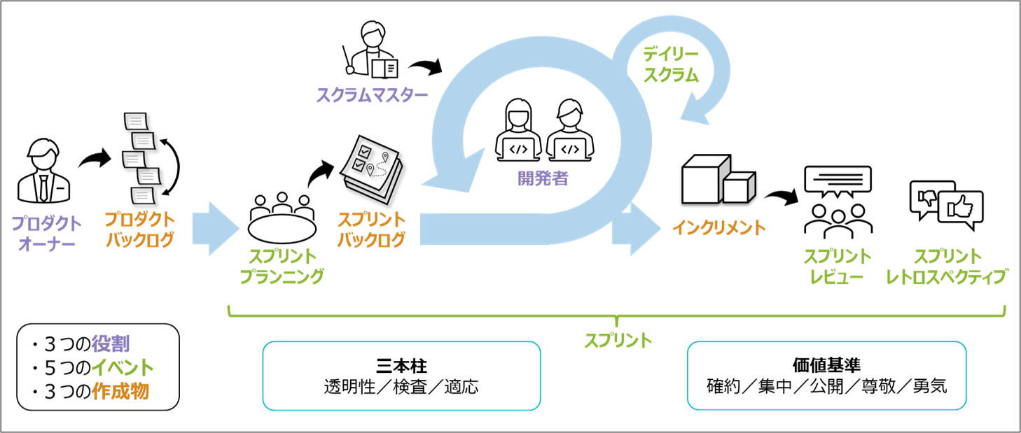 ・スプリント:スプリント内で他のイベントをすべて実施する。スプリントが終わり次第、次の新しいスプリントを始める。