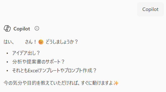 こちらは「返信に絵文字を入れるようにして」とお願いをしているCopilotに呼びかけをしてみた画像です。