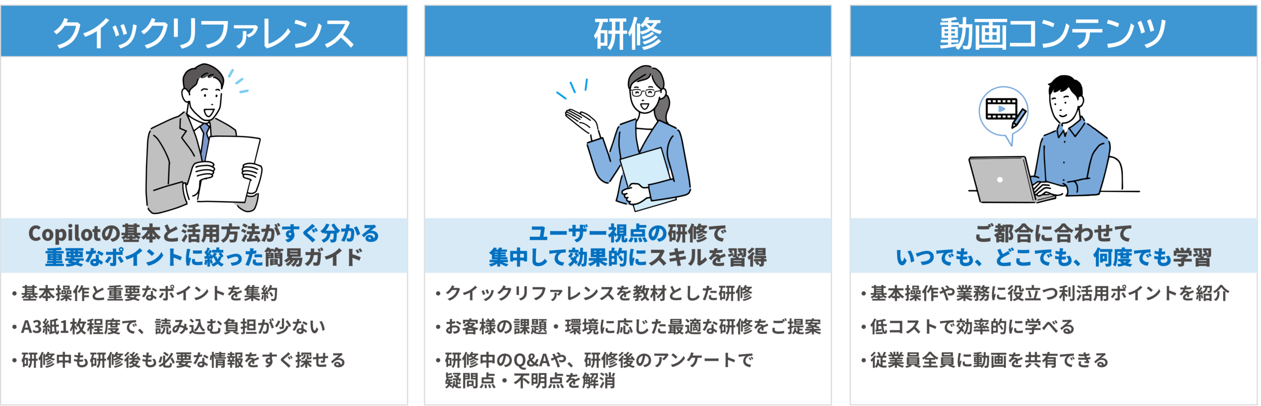 マイクロメイツでは、Copilotを有効活用できる人材を育成するための研修や学習教材をご用意しています。