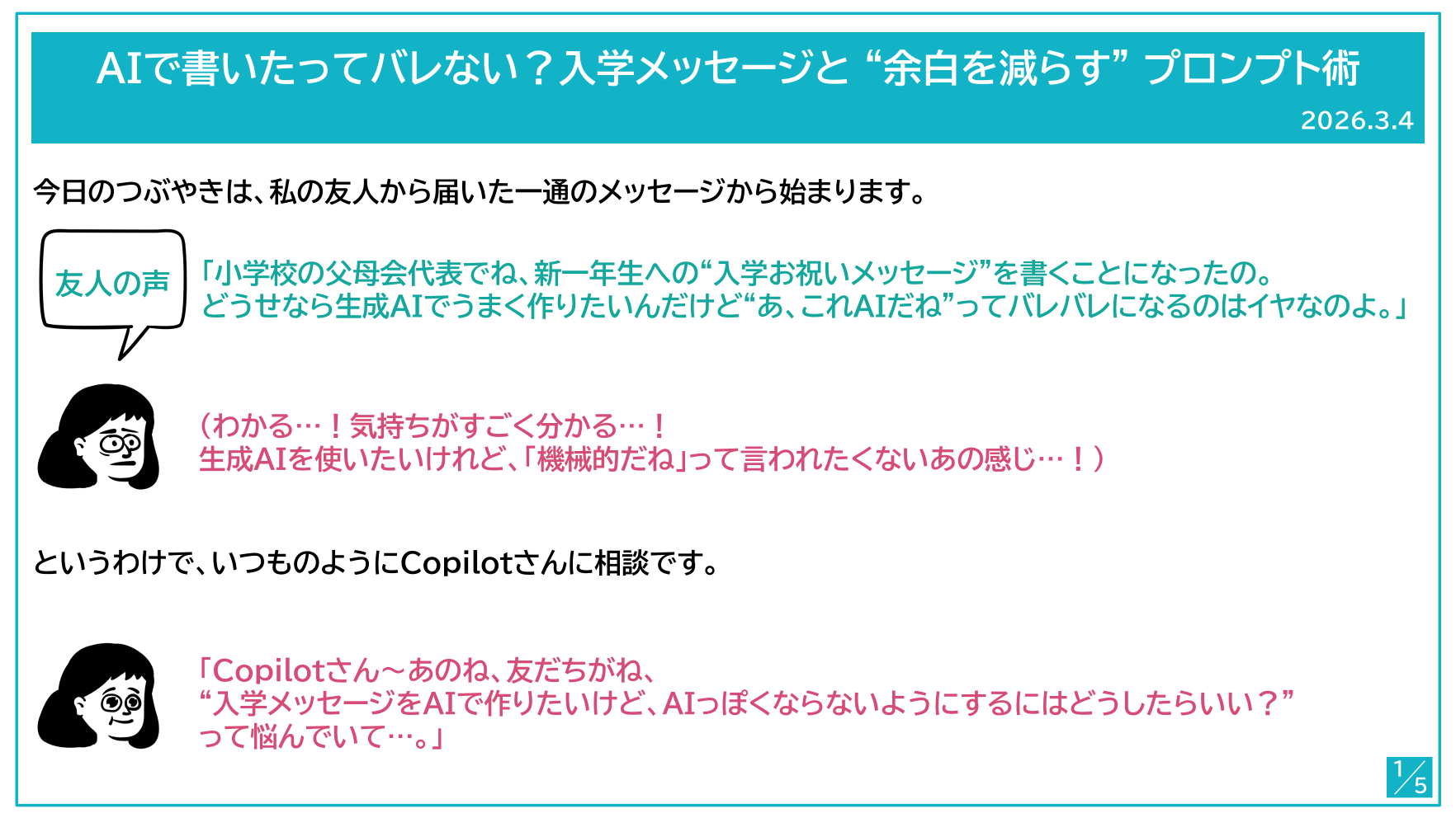 コンシェルジュのつぶやきとは、その他の学習コンテンツとは一味違い、AIまな部の推進部長 兼 コンシェルジュのアキヤマが「なるほど!」と思えるようなCopilotに関する小さなヒントをお届けできるよう、週一回くらいのペースでお届けしているコラムです。