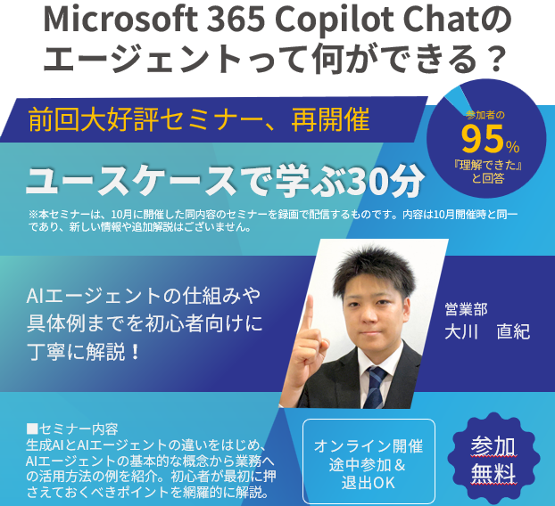<好評につき再開催!> 前回95%の参加者が「理解できた」と回答したオンラインセミナー【Microsoft 365 Copilot Chatのエージェントって何ができる?ユースケースで学ぶ30分】を、12月18日(木)に再び開催します。