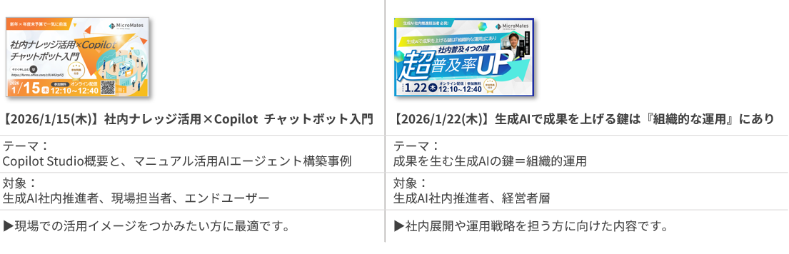 年末が近づき、今年度の振り返りや来期への準備が本格化する時期となりました。「年度末予算をどう活かすか」「新しい取り組みを来期につなげたい」とお考えの方へ、Copilot活用と“組織で効く”AI運用を学ぶ、社内推進者から現場担当、エンドユーザーまで役立つ情報をお届けする2週連続オンラインセミナーをご案内します。ぜひご参加ください!